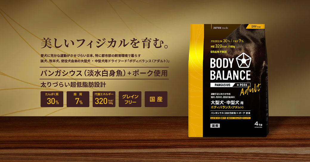 日本では一部の地域を除き、リードを付けた運動しかできません。特に都市部では生活する面積も狭くなりがちで、運動量も限られます。BODY BALANCEのドライフードは、この飼育環境のなかで特に太りやすい大型犬・中型犬たちに、ボディコンディションスコア〈BCS3 理想体型〉を維持することを栄養設計の方針としています。低カロリー・低脂肪で太りすぎを抑えるだけでなく、健康的な筋肉の維持を支える良質なたんぱく質を採用。さらに体重を支える関節に配慮する成分、腸内環境をケアする成分などを配合しています。