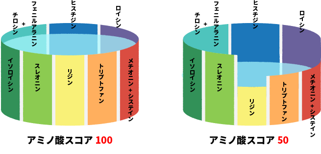 他にもポークには、犬にとって必要な動物性の脂質であるオレイン酸を多く含むほか、必須アミノ酸の中の分岐鎖アミノ酸(BCAA:バリン、ロイシン、イソロイシン)が健康的な筋肉を維持に重要な役割となります。栄養学的なアミノ酸スコアという指標があり栄養成分の種類や量だけではなく、考慮したいのが質です。ポークはアミノ酸バランスが良く(下部 桶の理論ご参照)余剰なアミノ酸が少ないので、その代謝により産生される窒素老廃物が少なく、腎臓への負担が少ないと言われています。(腎臓の濾過機能は加齢とともに低下すると考えられています)